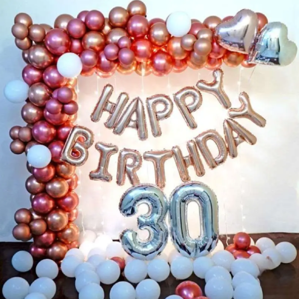 This professional setup features a dense, L-shaped organic garland in shimmering rose gold chrome, accented by crisp white balloons and metallic silver hearts. Perfect for 30th birthdays or anniversaries, this package includes suspended foil lettering and a fairy light curtain to ensure your celebration glows from every angle.