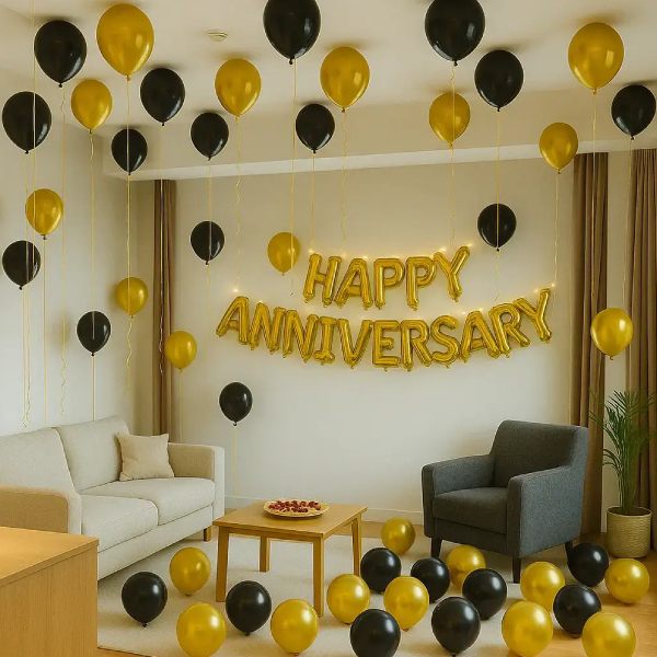 Elevate your home celebration with our Executive Black & Gold. This comprehensive service focuses on a sophisticated monochrome palette of matte black and metallic gold. We transform a standard living area into a premium lounge using high-density ceiling clusters with elegant gold ribbon trails, a wall-mounted illuminated “Happy Anniversary” banner, and a coordinated floor-fill for a total immersion experience.