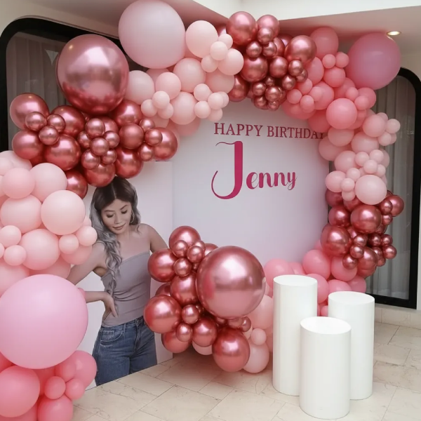 Make a statement with our Grand Rose Signature. This elite installation combines a sleek, custom-printed name wall with a lush, “spill-over” organic balloon design. We use a sophisticated palette of metallic rose gold chrome and soft matte blush to create a high-contrast, professional photo-op. To complete the look, we include a set of tiered minimalist white pedestals, perfect for displaying a cake or floral arrangements.