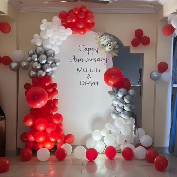 Make your anniversary unforgettable with our Arch of Romance. This premium setup features a custom-shaped “Gothic Arch” backdrop board, personalized with high-fidelity vinyl lettering for names. We frame the personalization with a dense, multi-textured organic garland using a striking mix of crimson red, chrome silver, and matte white balloons, finished with delicate dried pampas accents.