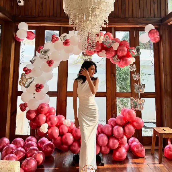 Step into a fairytale with our most enchanting ring design. This setup features a massive circular frame draped in an organic blend of pearl white and metallic magenta balloons, accented with shimmering silver butterfly details. Set against a rustic wood-framed backdrop and illuminated by natural light, it creates a breathtaking, high-fashion focal point for birthdays and special portraits.